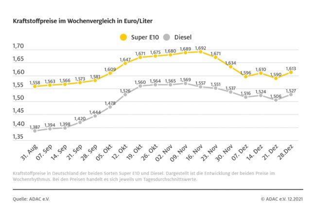 München (ots) – Zum Ende des Jahres müssen Autofahrer beim Tanken noch einmal tiefer in die Tasche greifen. Laut aktueller ADAC Auswertung der Kraftstoffpreise kletterte der Preis für einen Liter Super E10 im Vergleich zur Vorwoche um 2,3 Cent und liegt derzeit im bundesweiten Mittel bei 1,613 Euro. Diesel kostet im Schnitt 1,527 Euro, das ist…