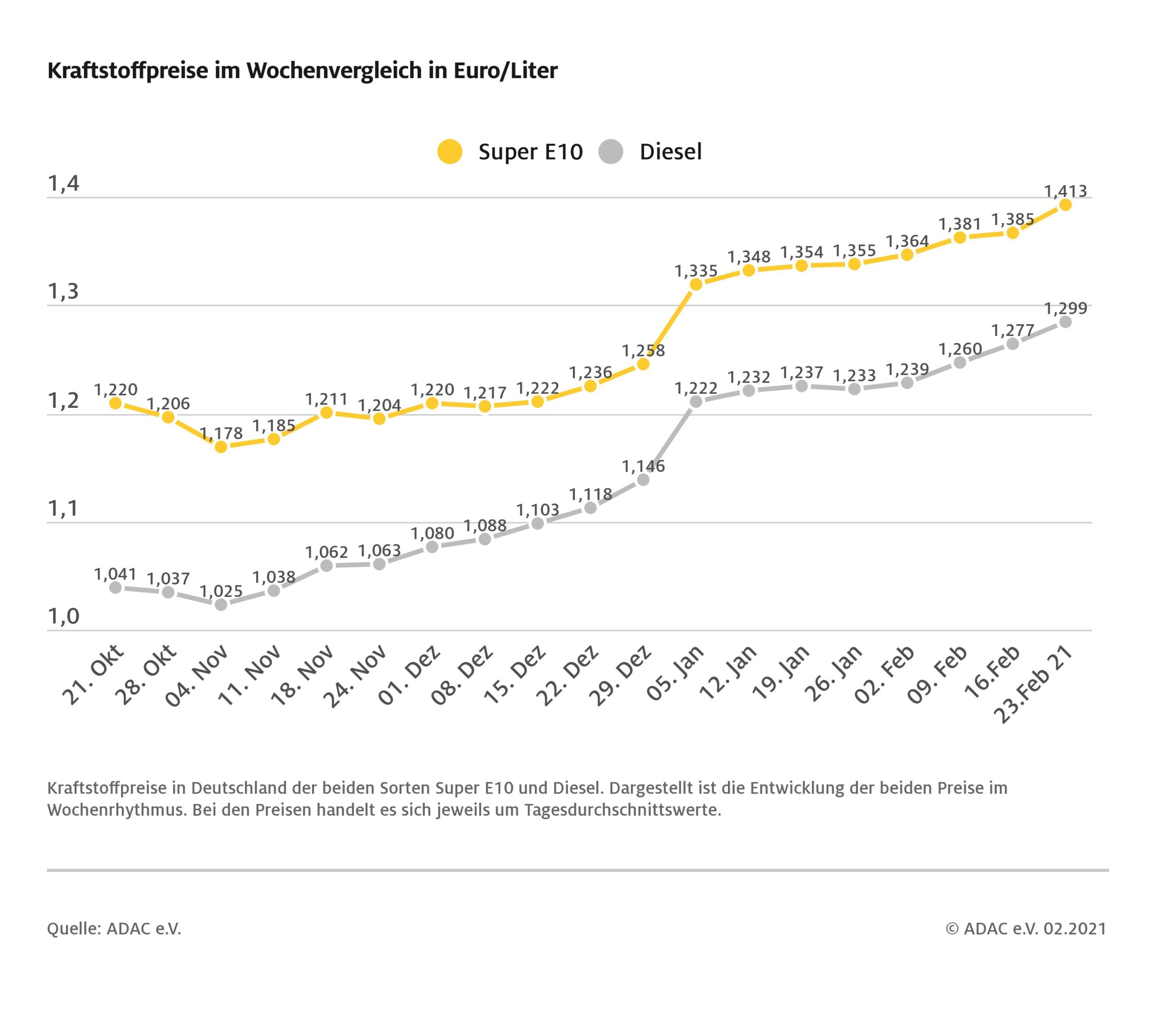 Benzin und Diesel sind seit der vergangenen Woche deutlich teurer geworden – eine kräftige Verteuerung auf dem Rohölmarkt gibt es indes nicht. Wie die wöchentliche ADAC Auswertung der Kraftstoffpreise zeigt, kletterte der Preis für Superkraftstoff binnen Wochenfrist um 2,8 Cent je Liter. Damit kostet ein Liter Super E10 derzeit im bundesweiten Mittel 1,413 Euro und hat zudem erstmals seit Januar 2020 wieder die Marke von 1,40 Euro übersprungen. Für einen Liter Diesel müssen die Autofahrer im Schnitt 1,299 Euro bezahlen, das sind 2,2 Cent mehr als in der Vorwoche.
