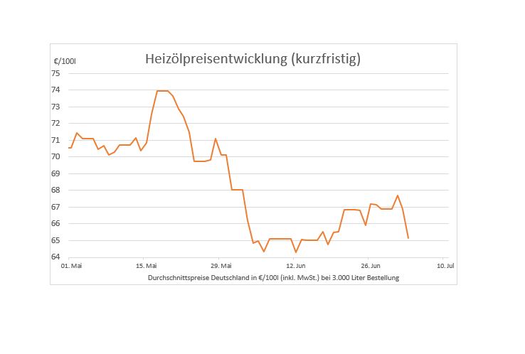 Hinweis: Die genannten Heizölpreise beziehen sich stets auf den deutschlandweiten Durchschnittspreis bei einer Bestellung von 3.000 Liter Heizöl Standard schwefelarm inklusive 19% MwSt.. Durch Transportkosten fallen die Preise regional jedoch unterschiedlich aus. Die Preisspanne zwischen den Regionen kann daher momentan bei bis zu ca. 4,99 Euro pro 100 Liter liegen. Stand der Preise: 03.07.2019