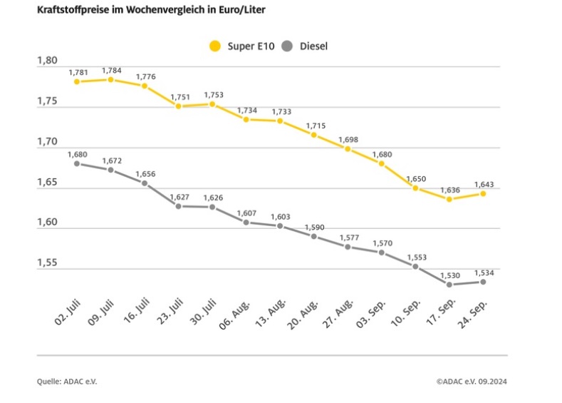 Nach mehreren Wochen mit rückläufigen Preisen sind die Kraftstoffpreise erstmals seit Juli im Wochenvergleich wieder gestiegen. Das ermittelt der ADAC in seiner wöchentlichen Auswertung der Spritpreise. Super E10 kostet im bundesweiten Schnitt derzeit 1,643 Euro je Liter und damit 0,7 Cent mehr als in der Vorwoche.