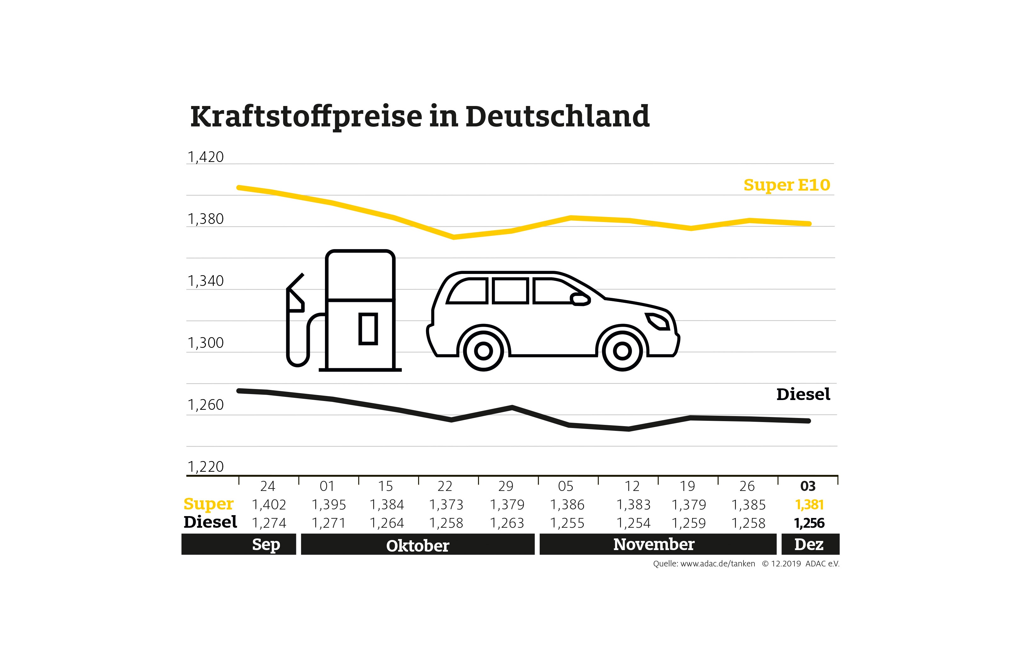 Autofahrer können im Bundesdurchschnitt preiswerter tanken als in der Vorwoche. Laut aktueller Auswertung des ADAC kostet derzeit ein Liter Super E10 im Bundesmittel 1,381 Euro, das ist ein Rückgang von 0,4 Cent. Diesel verbilligte sich um 0,2 Cent auf durchschnittlich 1,256 Euro je Liter.
