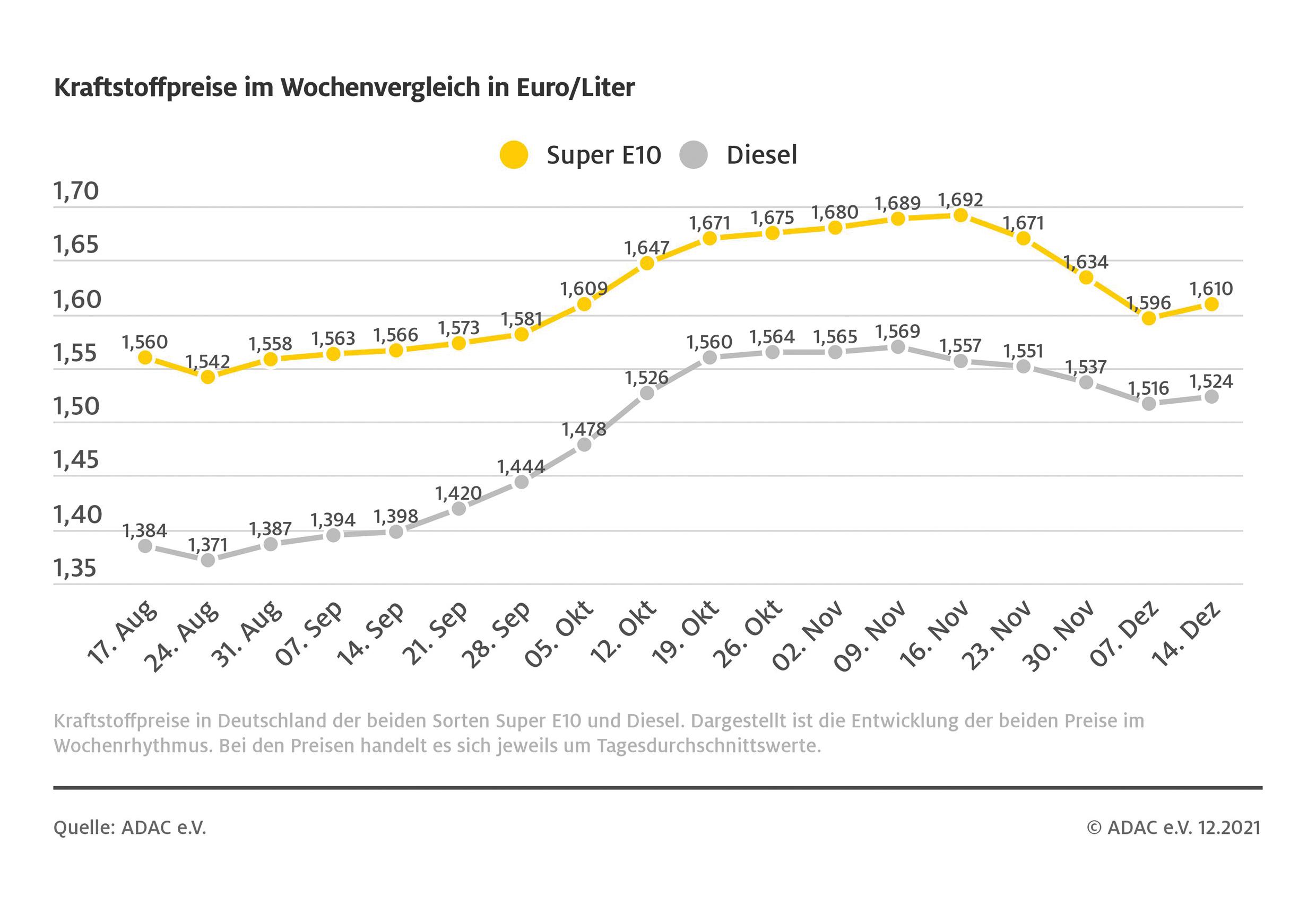 München (ots) – Der Benzinpreis hat nach einem dreiwöchigen Abwärtstrend wieder spürbar angezogen. Laut aktueller ADAC Auswertung der Kraftstoffpreise kletterte der Preis für einen Liter Super E10 im Vergleich zur Vorwoche um 1,4 Cent auf durchschnittlich 1,610 Euro. Etwas schwächer fiel der Anstieg des Dieselpreises aus: Ein Liter kostet aktuell im bundesweiten Mittel 1,524 Euro und damit 0,8 Cent mehr als in der Vorwoche.