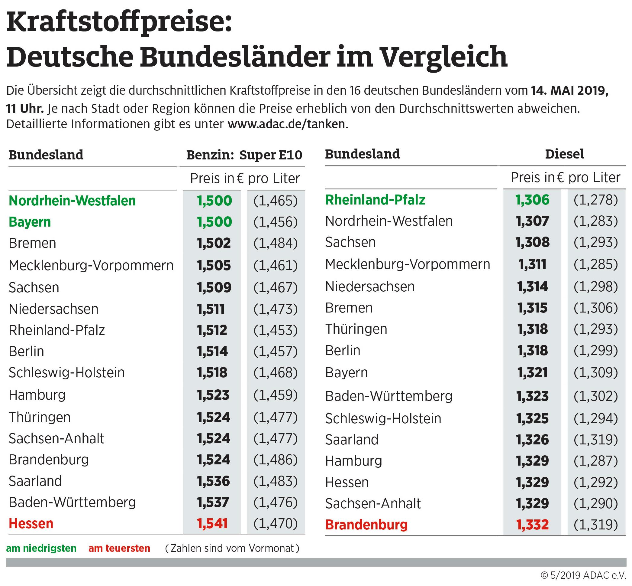 In der aktuellen Untersuchung hat der ADAC am heutigen Dienstag um 11 Uhr die Preisdaten von mehr als 14.000 bei der Markttransparenzstelle erfassten Tankstellen ausgewertet und den Bundesländern zugeordnet. Die ermittelten Preise stellen eine Momentaufnahme dar. Unkomplizierte und schnelle Hilfe für preisbewusste Autofahrer bietet die Smartphone-App „ADAC Spritpreise“. Ausführliche Informationen rund um den Kraftstoffmarkt gibt es zudem unter www.adac.de/tanken.