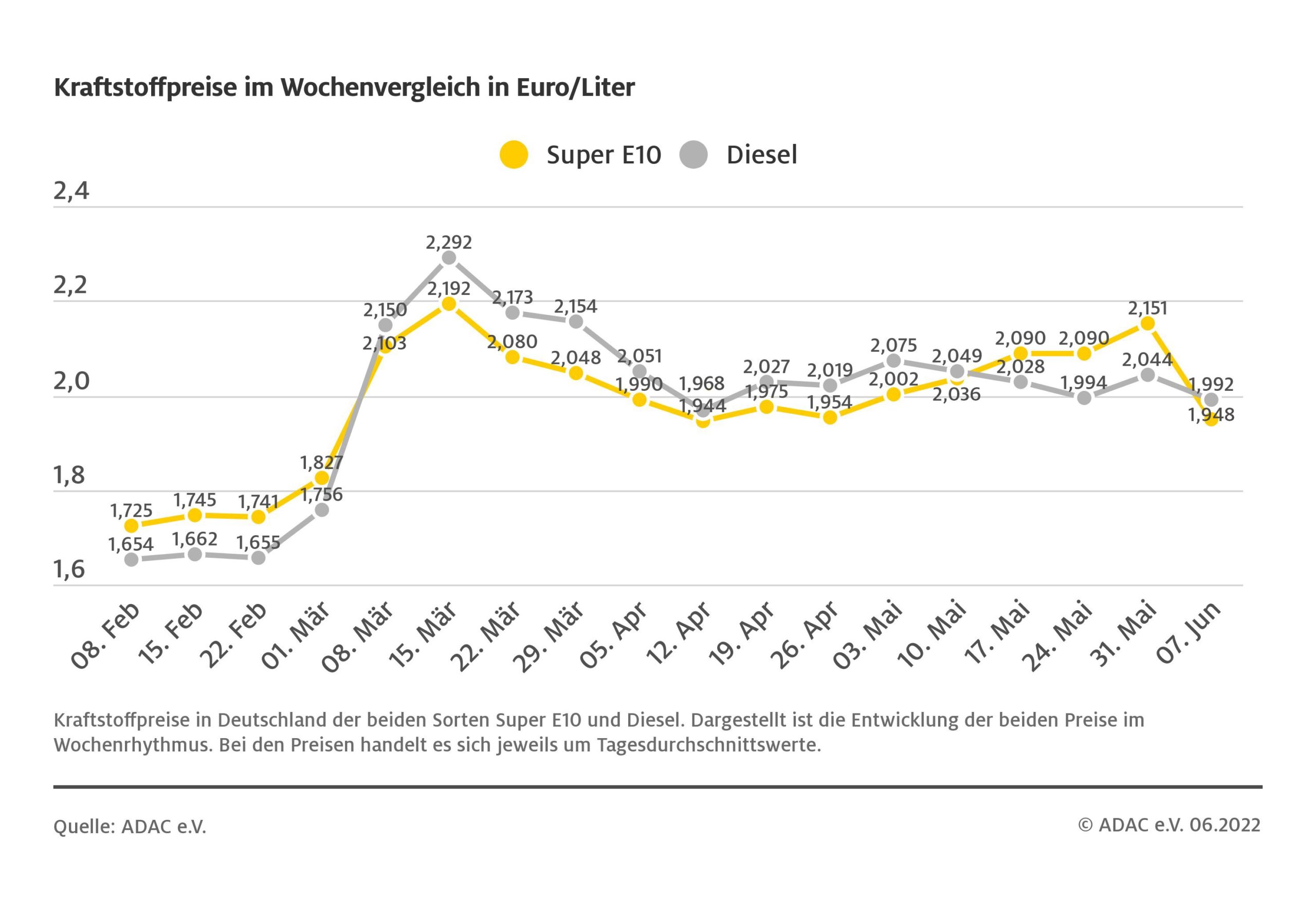 Seitdem die Steuersenkung in der vergangenen Woche in Kraft getreten ist und am ersten Tag zu einem spürbaren Rückgang der Kraftstoffpreise geführt hat, sind die Spritpreise seit dem 1. Juni jedoch täglich wieder nach oben gegangen. Zwar ist gleichzeitig der Ölpreis angestiegen (Rohölsorte Brent notiert bei 121 US-Dollar), was aber nur bedingt den Anstieg der vergangenen Tage erklärt. Der ADAC fordert, dass die Entlastungen jetzt vollständig bei den Verbrauchern ankommen müssen.